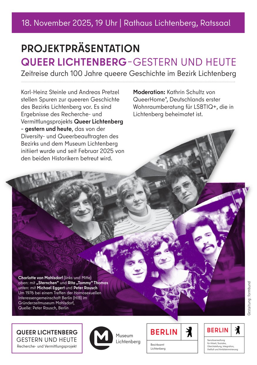 Zur Projektpräsentation der Ergebnisse des Recherche- und Vermittlungsprojekts Queer Lichtenberg - gestern und heute laden die Diversity- und Queerbeauftrage sowie das Museum Lichtenberg herzlich bei freiem Eintritt ein.