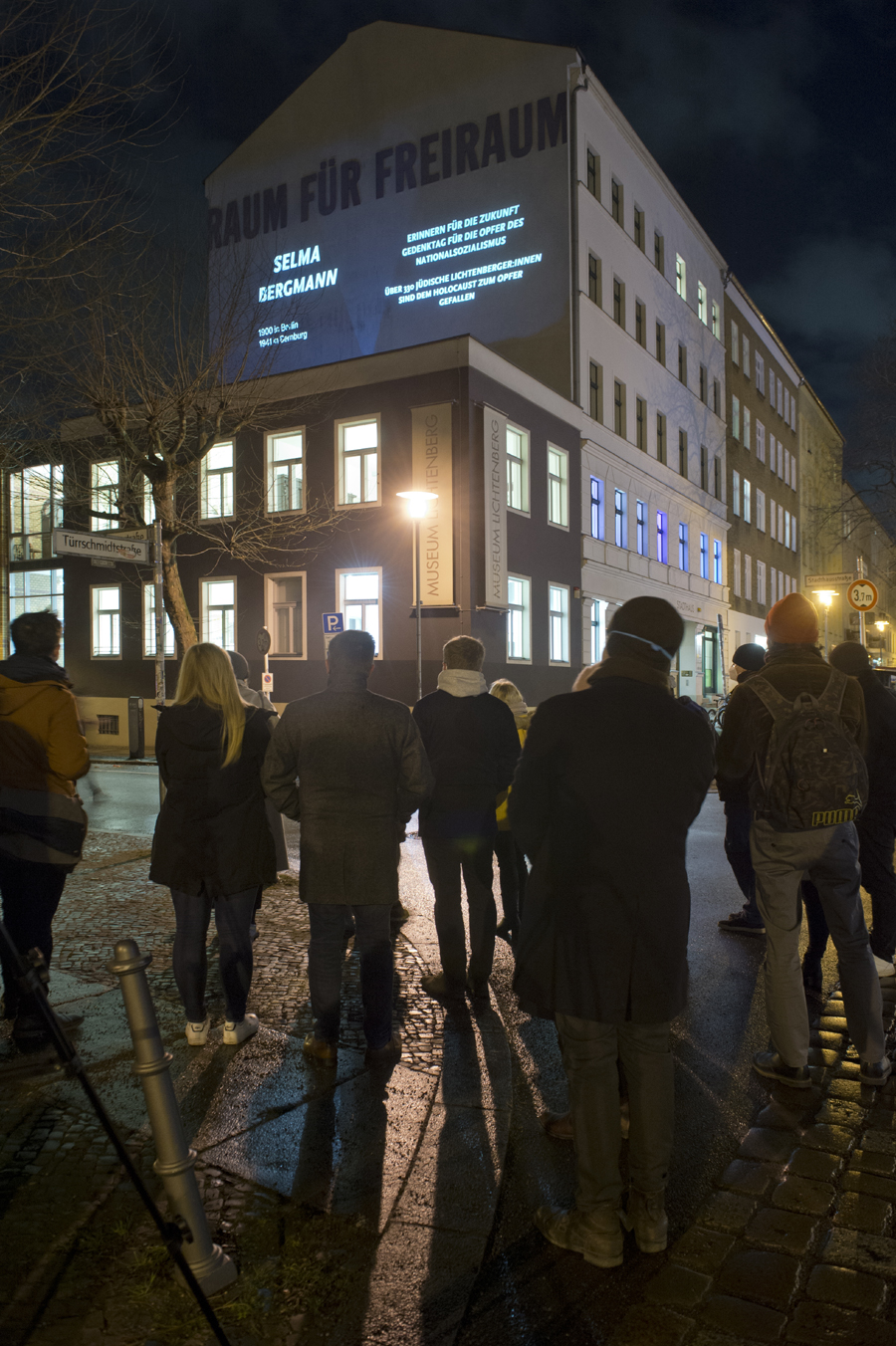 Wie in jedem Jahr beginnt auch 2020 um 18 Uhr an der Giebelwand des Stadthauses die Projektion von über 300 Namen der aus Lichtenberg und Hohenschönhausen vertriebenen und ermordeten Jüdinnen und Juden. Die Namen werden bis in die Morgenstunden des 28. Januar 2020 zu lesen sein.